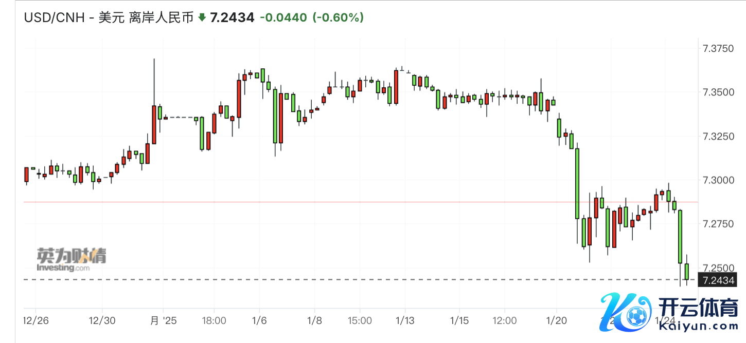 在好意思国总统特朗普认真就任后,东谈主民币势如破竹,限度北京时刻1月24日16:30,好意思元/离岸东谈主民币报7.2432,当日累计大涨近400点。相较于1月的7.37隔邻的最弱位置,依然累计大涨近1300点。